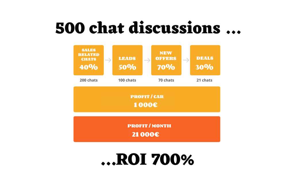 Let’s use an average profit of EUR 1,000 per car as an estimate. In this case, chat provides an additional income of 21,000 euros. So the return on a chat investment in a medium-sized car dealership is 600-700% – and there is no reason to believe that this is the upper limit.
